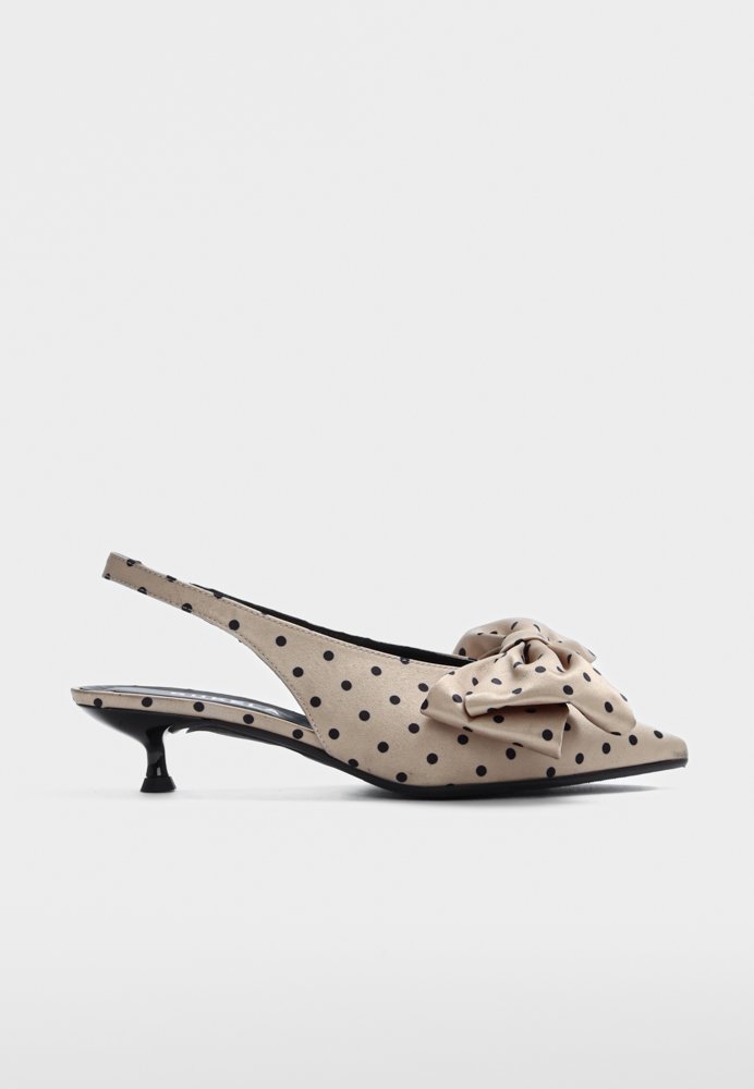 Olivia sandalen i Camel Polka er lavet i satin med læderfoer og gummisål. En feminin sandal med et dekorativt udtryk.
