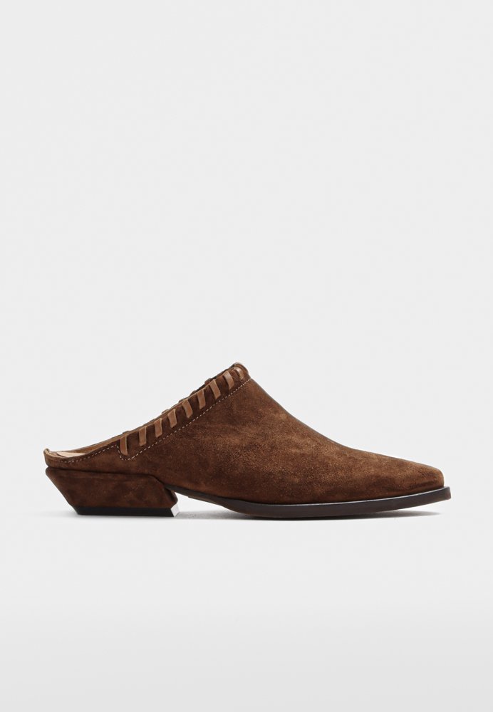Elvie skoen i Suede Cognac er lavet i ruskind med læderfoer og skridsikker gummisål. En sko i støvleform uden hælkappe med fine kantdetaljer.