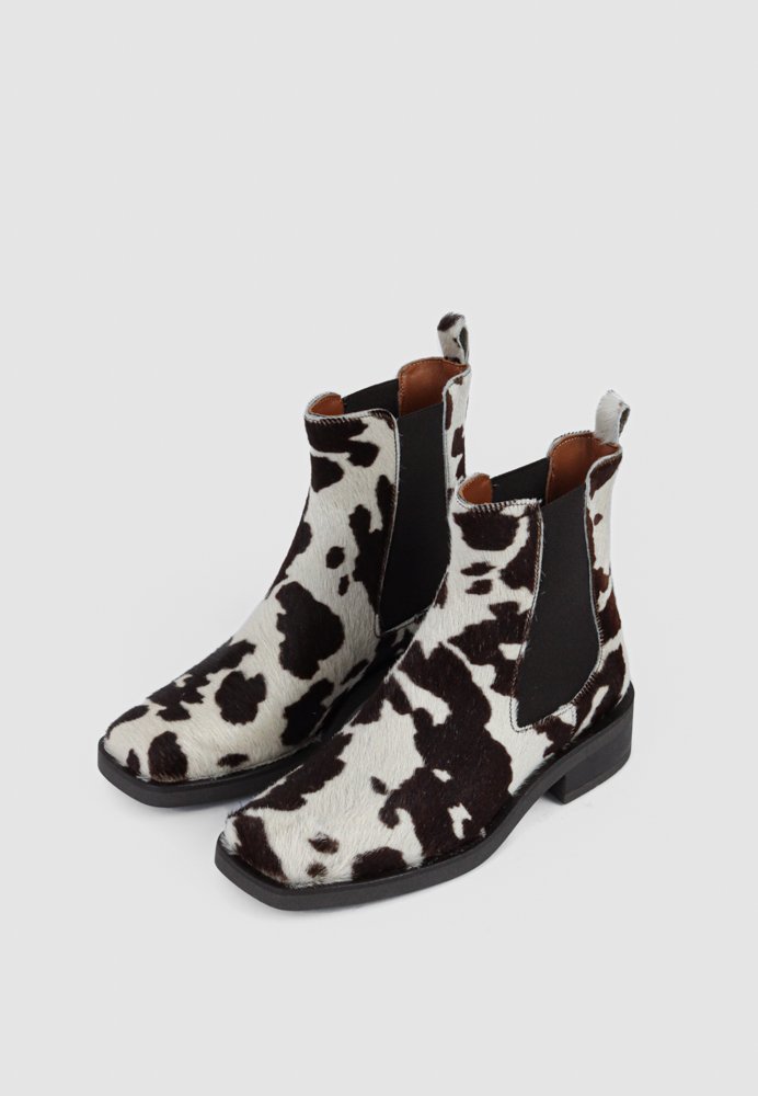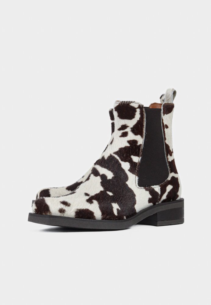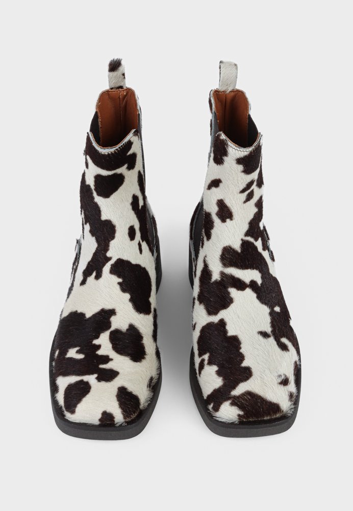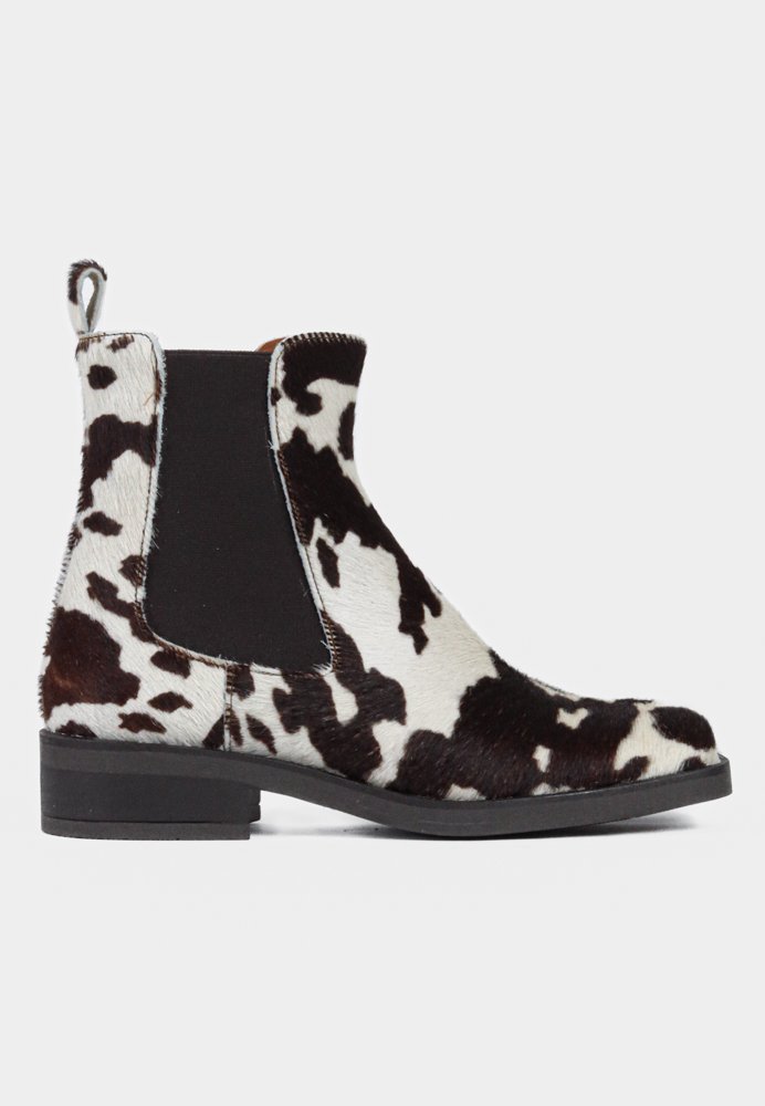 Rå og stilfuld støvle med karakteristisk cow-print, der kombinerer trend og tidløst design. Den enkle ankelhøjde, elastiske indsatser og stabile hæl giver en behagelig pasform og et moderne udtryk. En markant støvle, der løfter både hverdags- og weekendgarderoben.