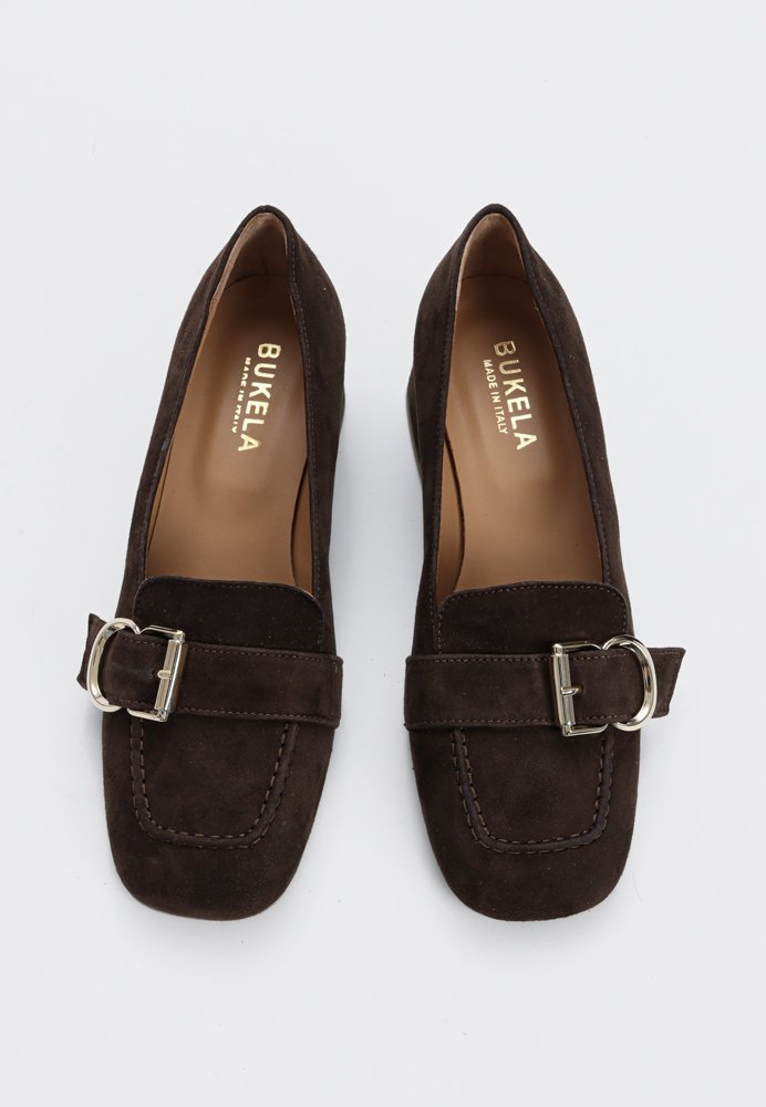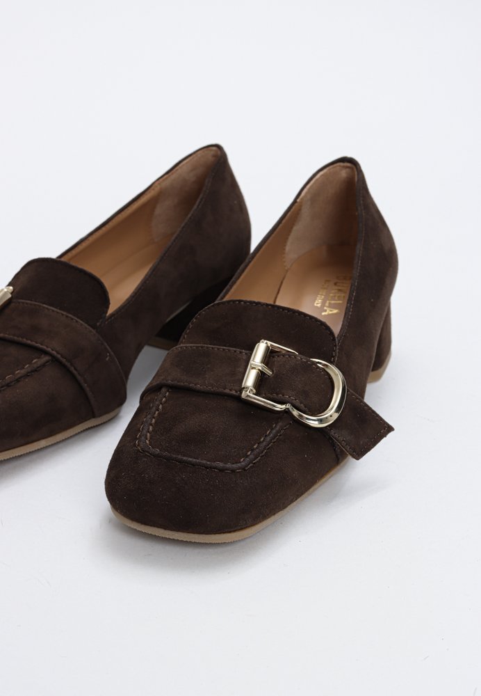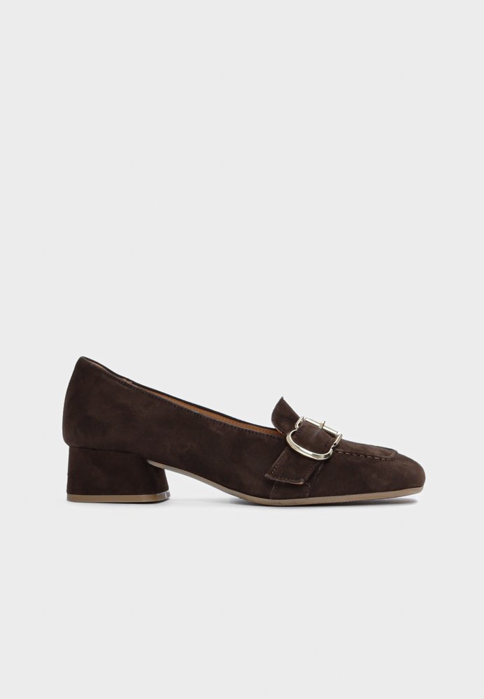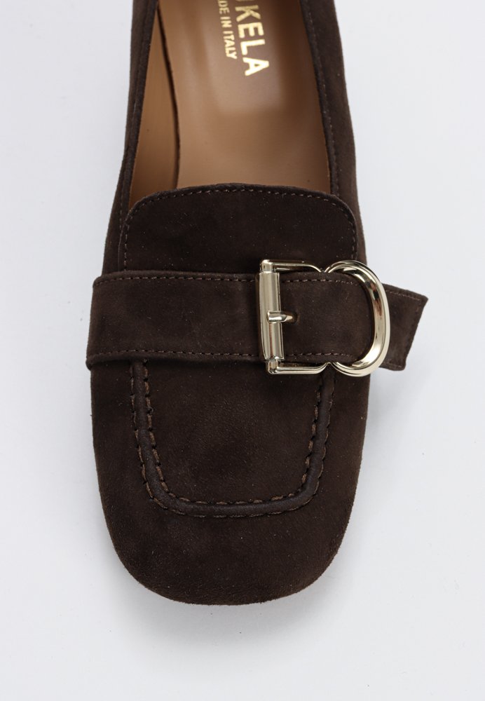 GISLA er udført i blødt ruskind i en dyb espresso-brun nuance, som giver et eksklusivt og sofistikeret udtryk. Det guldfarvede spænde over vristen tilfører et feminint og stilfuldt element, mens den klassiske silhuet gør modellen velegnet til både festlige anledninger og elegant hverdagsbrug.
